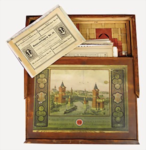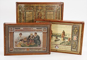 3 Steinbaukästen, 1x Nr. 8, 2-lagig, Orig.-Holzkiste, mit bunt lithogr. Deckbild, mit Anleitungsheft, auf Vollständigkeit nicht geprüft u. Nr. 13a, Herzberg mit Metallteilen, Nr. 12a, Mehldorf, Orig.-Holzkiste mit bunt lithogr. Deckbild, ohne Anleitung, Frontschilder an der Holzkiste ergänzt, auf Vollständigkeit nicht überprüft