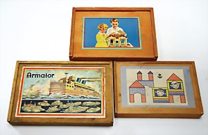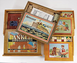 Anker, VEB Steinbaukasten, Nr. 10, 3-lagig ohne Anleitung auf Vollständigkeit nicht geprüft, Orig.-Holzkiste, mit bunt lithogr. Deckbild, dazu 3x Armator Holzbaukasten, Holz u. Blechteile, ohne Anleitung, Orig.-Kisten, mit bunt lithogr. Deckbild, auf Vollständigkeit nicht geprüft, 2 Teile Holzbaukasten, Gebäude, wohl weitgehend kompl., ohne Anleitung
