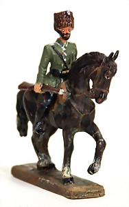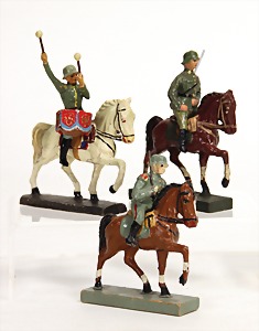 3 Teile Masse, 2. Weltkrieg, 7 cm u. 7,5 cm, Elastolin, Paukenschläger, Zust. 2, dazu 2 Reiter ungem., insgesamt Zust. 2-3
