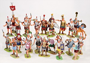 Elastolin, Kunststoff, 25 Teile Römer, 7,5 cm, darunter 1 Figur Trommler, Trommlerstock weg gebrochen, sonst guter Zust.