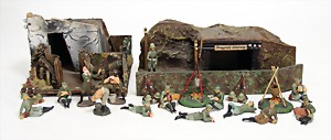 Elastolin u. Lineol, 2 Bunkeranlagen, dazu 12 Figuren, Lagerleben, 2. Weltkrieg, 7,5 cm, Masse, meist Zust. 2