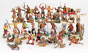 Elastolin, gr. Konv. Kunststoff u. Masse Indianer, 7,5 cm, darunter auch ein Totenpfahl, 2 Figuren übermalt, Siedler u.a., Zust. 2-3