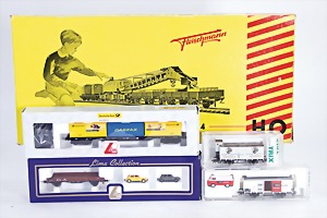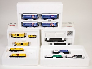 Fundkiste, Eisenbahnmodell, H0, Interkargo-Express, Sonderserie 004A, 014, 703, 3x, neuwertig, Orig.-Kart., 5 Güterwagen TRIX, 2x FLEISCHMANN, 4x ROCO, MÄRKLIN-Baureihe 81, alles neuwertig, Orig.-Kart., dazu einige Teile Eckerbahn, Schmalspur, 12 Werbewagen, Kleinbahn im Set, schönes Konv., bitte besichtigen