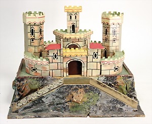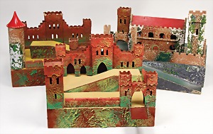 3 Ritterburgen, Pappmaché u. Holz, ohne Figuren, 1x nicht kompl., Grundmaß: 1x 36 cm x 32 cm u. 1x 37 cm x 32 cm, 1x 45 cm x 37 cm