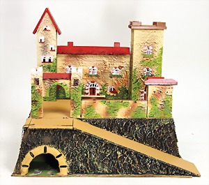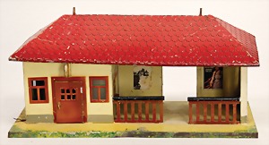 Bahnhof mit Bahnsteig-Überdachung, Blech handlackiert, Fenster u. Tür Einfassungen lithogr., H: 16 cm x 23 cm, bespielt, altersbed. Lackfehler, mit aufgesetzten Fensterläden, (3 Fensterläden fehlen)