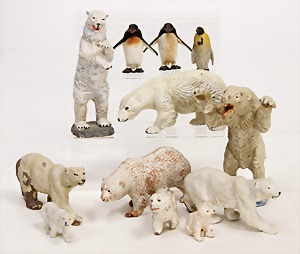 Eisbärengruppe, Masse, 8 Teile, untersch. Hersteller, dazu 1 Elastolin Bär, Kunststoff u. 3 Pinguine, meist Zust. 3