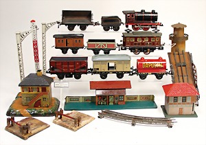 Konv. Blechspielzeug, 1x Antriebsmodell, Brunnen von Doll, 15 cm, altersbed. Farbabplatzer, 1 Blech-Gießkanne, 1 Schubkarre, 1 Trommel (Sparkasse), einige Teile Zinnfiguren, Tieren u. Bäume