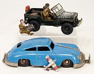 Jeep, 16,5 cm, Frontscheibe liegt lose bei, 2 Mann Besatzung, Kleinteile fehlen, Uhrwerk intakt, dazu 1 GESHA-Porsche, 356, Friktionsantrieb, stark bespielt