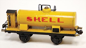 Spur 1, 2 achsiger Kesselwagen, Shell, Rahmen farbl. ausgebessert, Hahn weggebrochen, bespielt, gut, 24 cm