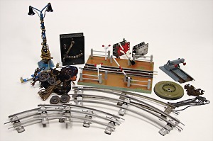 Fundkiste, Märklin u. andere, Kabelstränge, Bahnübergang, Unterteil für Kran, Schalter, Kleinteile, 1 Märklin-Lampe, 1 Prellbock, untersch. Zust., bitte besichtigen