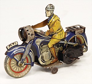 Scheinwerfer, Motorrad, Blech lithogr., Glas am Scheinwerfer fehlt, Feuerstein abgerieben, Uhrwerk intakt, bespielt, teilw. ein wenig Flugrost an den nicht lithogr. Teilen