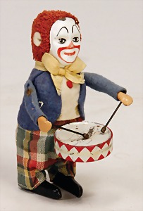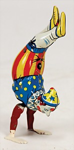 auf den Händen laufender Clown, Blech lithogr., US-Zone, 12 cm, Uhrwerk intakt, sehr guter Zust.