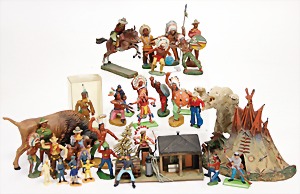 Konv. Indianer- u. Cowboyfiguren, Elastolin u. Kunststoff, mit teil kl. Beschädigungen, dazu 1 Tipi, 15 cm, 1 Bison u. 1 Eisbär, Elastolin, Riss an li. Pfote