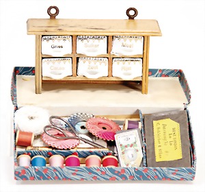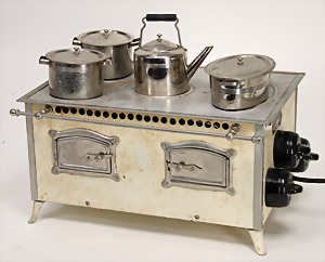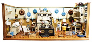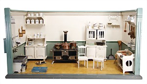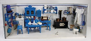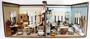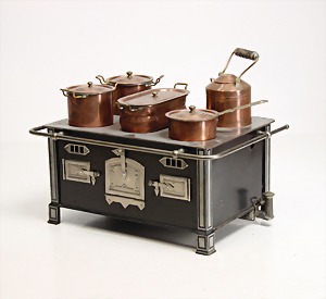 Puppenküchengehäuse, 80 cm x 42 cm x 32 cm, mit Küchenmobiliar, Holz bemalt, kl. Blechherd mit Töpfesatz, einige Ausschmückungsteile, Porzellan, Keramikteile, kl. Kühlschrank von IFZIT