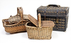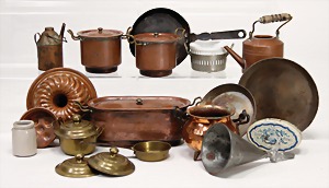 2 Kupfertöpfe, 1 Wasserschiff, L: 13,5 cm, 3 Pfannen, 1 Kupferkessel, 3 Bein gehämmert, Brotdose, Kuchenform, Petroleumpfanne
