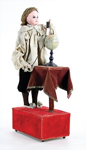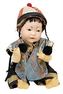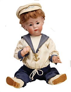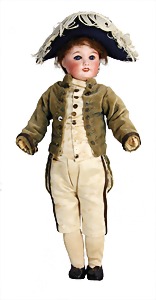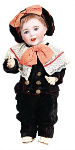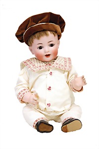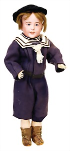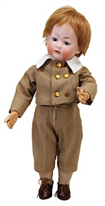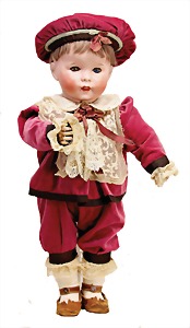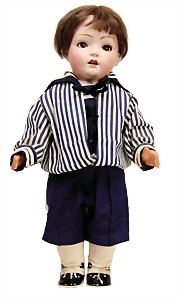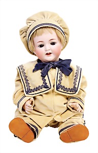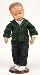 Junge, Kunststoffkopf, etwas Farbabrieb am Hinterkopf u. auf der Nasenspitze, Stoffkörper, etwas angeschmutzt, 45 cm