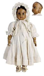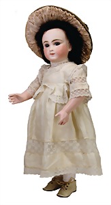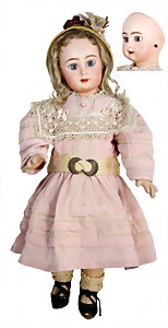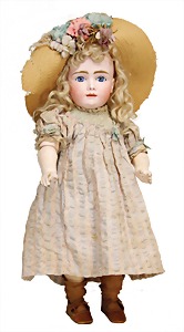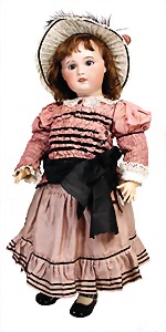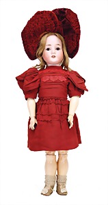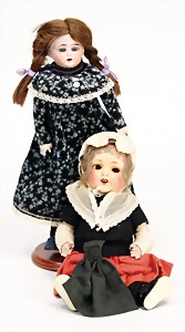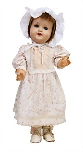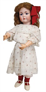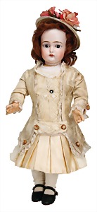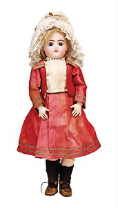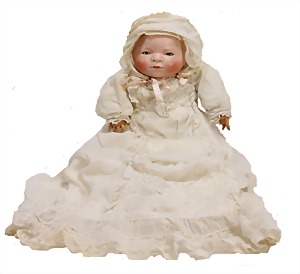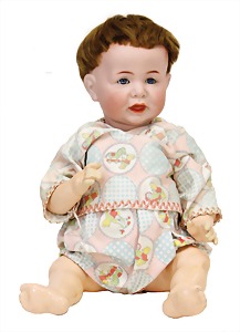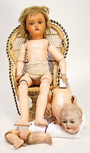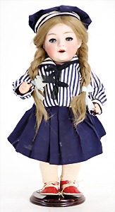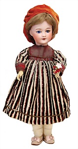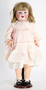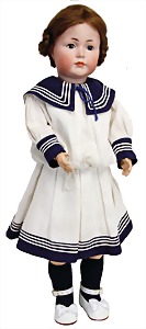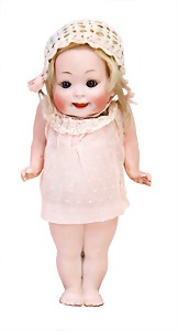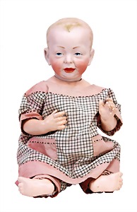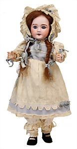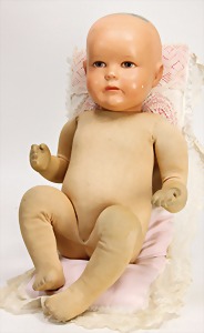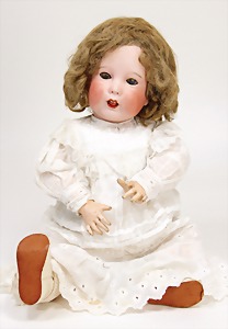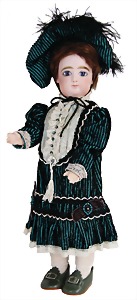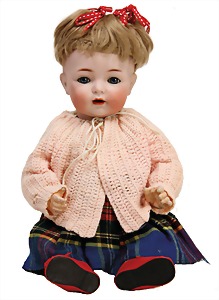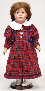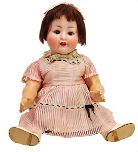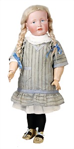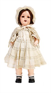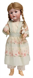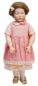 Mädchen, Kunststoffkopf, Gesicht stellenw. überstrichen bzw, Farbe an den Wangen u. Nasenspitze etwas abgerieben, Echthaarperücke, aus Stoffkörper, etwas angeschmutzt, 47 cm