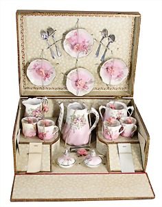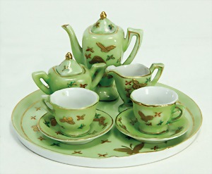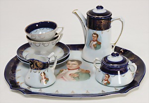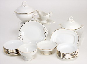 Puppenspeiseservice, gem. GJY, mit 6 flachen u. 6 tiefen Tellern, Durchm. 11 cm, Suppenschüssel mit Deckel, Durchm. 11 cm, glasiertes Keramik mit Goldrand, 3 Schalen, 1 Platte, 1 Sauciere