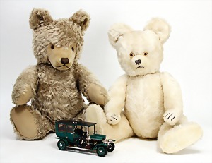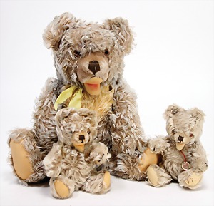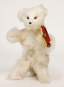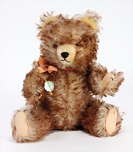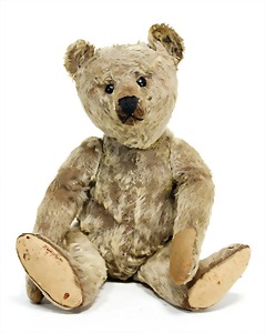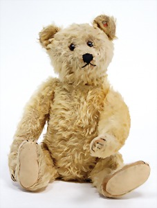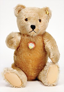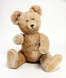 Bär, ca. 1930, blond, 40 cm, planker Knopf, Reste roter Fahne, lange abgeknickte Arme, leichter Buckel, Stimme defekt, Filz bis auf minim. Stellen gut, Mohair teilw. abgeliebt, Stoff an einem Bein etwas aufgerissen, schöner Ausdruck
