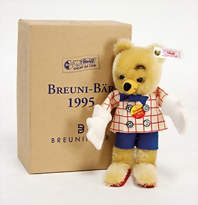 Breuni-Bär, 1995, Werbefigur, mit Knopf, Schild u. Fahne, Orig.-Kart., Deckel, Unterteil getapet
