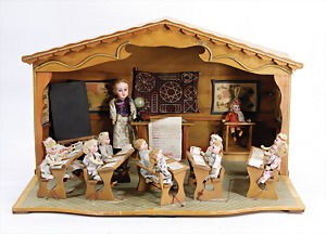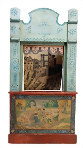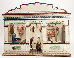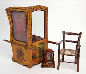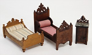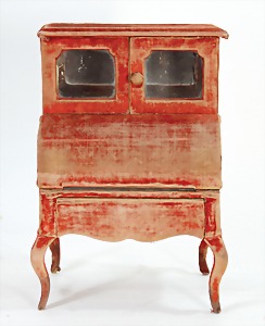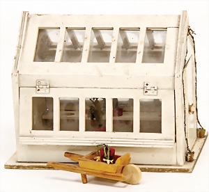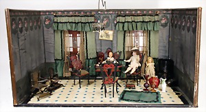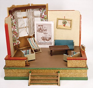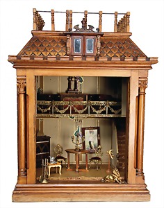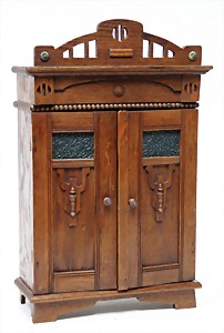 Puppenhaus, Eiche Massiv, H: 72 cm, B: 51,5 cm, vorne off., Treppe u. Empore, seitl. angedeutete Fenster mit Spiegelglas, wohl um 1900, Dekorativ