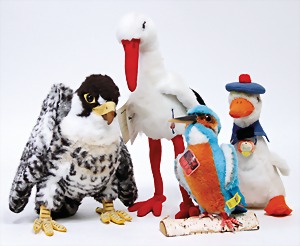 Konv. Steiff, Studio, Specht, kompl., goldener Knopf, gelbe Fahne, Nr. 2405/20, 1 Raubvogel, gelber Knopf, ohne Schild u. Fahne, 26 cm, Ente, kompl., Nr. 4907/25, silbener Knopf, Storch-Clemens, neuere Produktion, guter Zust.
