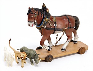 4 Teile Masse, Zugpferd, 18 cm, Nashorn u. Löwe, kl. Serie, 1 Hund, 7,5 cm, guter Zust.