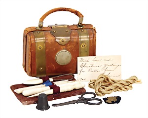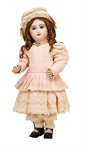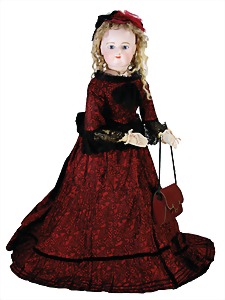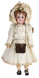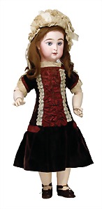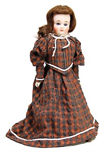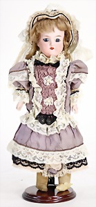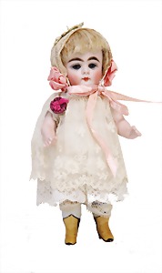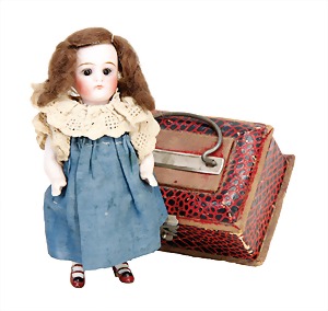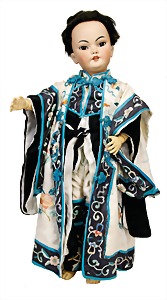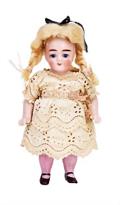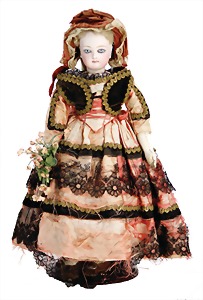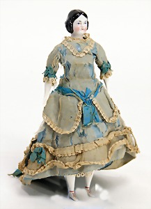 Porzellan-Brustblattkopf-Puppe, Thüringen, um 1860, glasiertes Porzellan, schwarz ausmodellierte Frisur, auf Stoff-Körper, mit Porzellan-Unterarmen u. -Unterschenkeln, anmodellierte Schuhe, 26 cm, originale Kleidung u. Unterkleidung, stellenw. etwas verschlissen