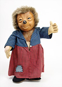 Mecki, ohne Knopf, Schild u. Fahne, 52 cm, an den Fingerspitzen etwas aufgegangen, Holzwolle sichtbar, bespielt, Vinyl-Gesicht