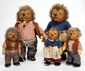 5 Mecki-Figuren, bespielt, 3x 17 cm, davon 1x Micki, mit Schild, sonst alle ohne Knopf, Schild u. Fahne, 2x 26 cm