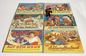 6 Mecki-Bücher, Mecki im Schlaraffenland, Auf dem Mond, Bei den Indianern, Bei den Eskimos, Bei den Chinesen u. Bei Aladin, dazu kl. Peter-Mecki-Figur, mit Schild, Schornsteinfeger, 9 cm