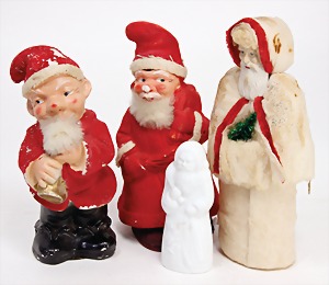 4x Weihnachtsmann, 1x Watte, mit Pappmaché-Gesicht, 24 cm, 2x Masse/Keramik, beflockt, 20 cm u. 22 cm, etwas Farbabrieb, 1x Porzellan, 13,5 cm