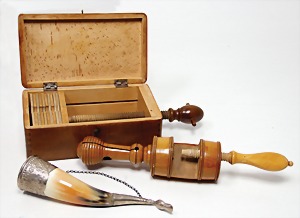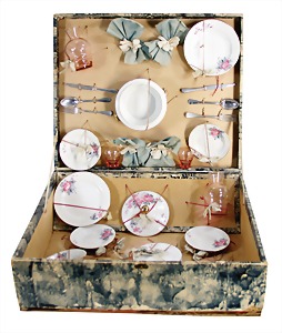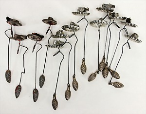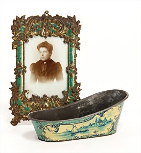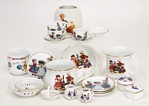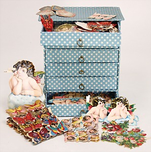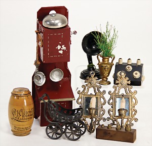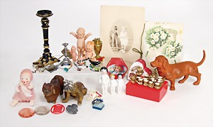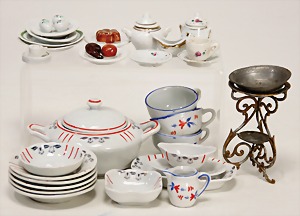 Konv. Puppenstubenausschmückungsteile, kl. Kaffeeservice, Knochen vergoldet, Zinnpokal mit Ständer, 12 cm, 2 kl. Telefone, 3 kl.Porzellanpüppchen, 5 cm und 6,5 cm, Konv. Winterhilfswerk, Anstecknadeln und Anhänger Porzellan, 2 alte Hochzeitskarten u.a.