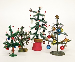 4 Puppenstuben-Weihnachtsbäume, teilw. mit Glaskugeln, 10 - 18 cm