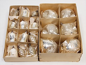 Konv. Weihnachtsschmuck, Glas, 12 Glocken u. Zapfen, 6 gr. Weihnachtskugeln, 1 davon defekt, Länge: 12 cm, im Orig.-Kart.