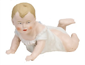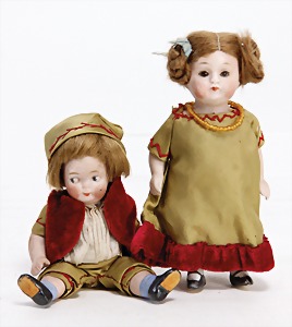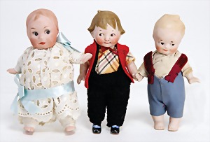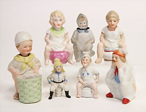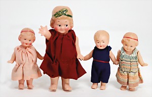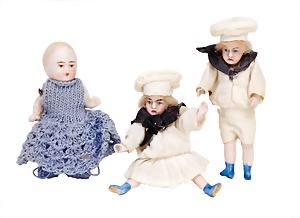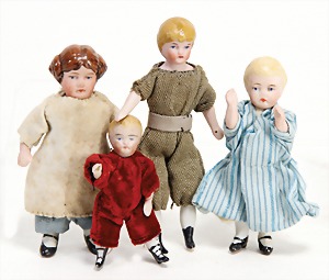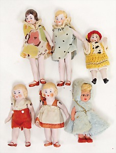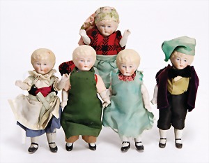 5 Porzellan-Puppenstuben-Puppen, Ganzbiskuit, bewegl. Arme u. Beine, modellierte Frisur, modellierte Schuhe, 5 - 7 cm