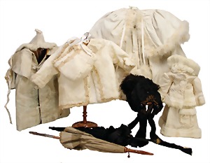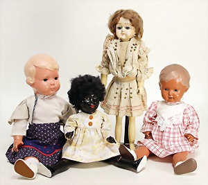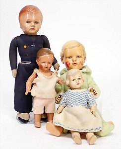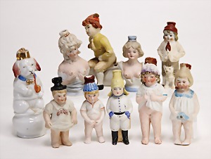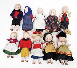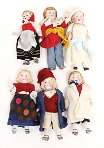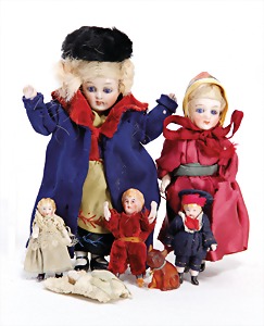 Konv. Ankleide-Puppen u. Kleidung, 1900 - 1920, untersch. Größen, 8 - 15 cm, dazu 1 Orig.-Kart. "Praktisches Kochbuch", Henriette Davids, ohne Inhalt
