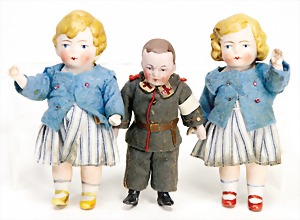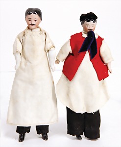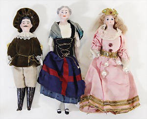3 Porzellan Puppenstubenpuppen mit Porzellanbrustblatt, Stoffkörper, Porzellanarme u. Unterschenkel, Mann mit Schnurrbart, Großmutter, schön ausmodellierte Gesichtszüge, Frau mit Kunsthaarperücke, 15 - 16,6 cm, Kleidung teilw. nachgenäht