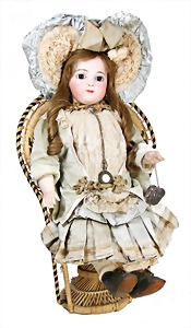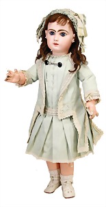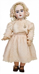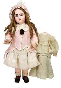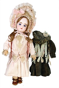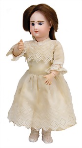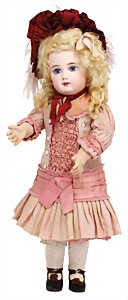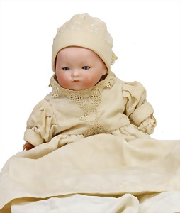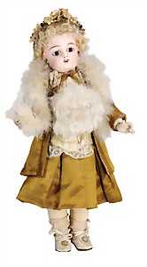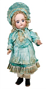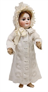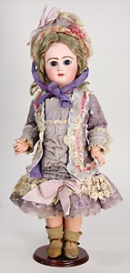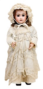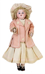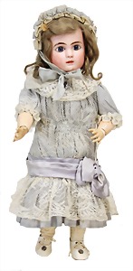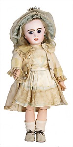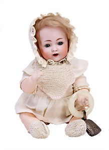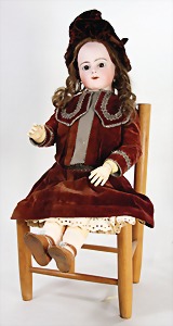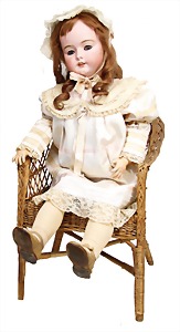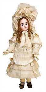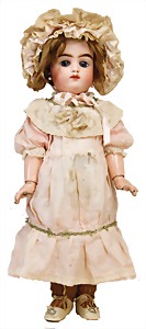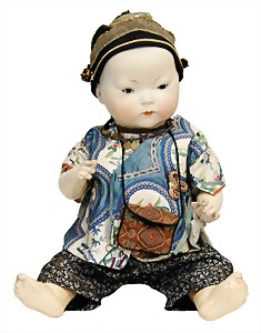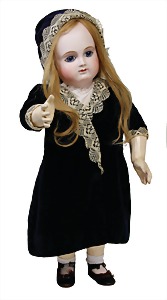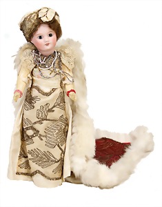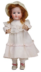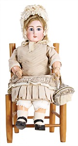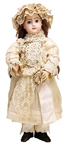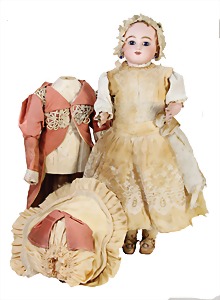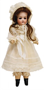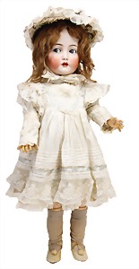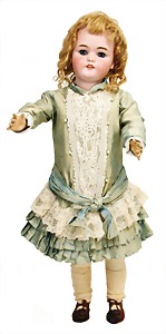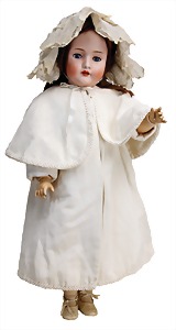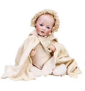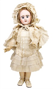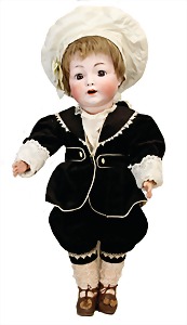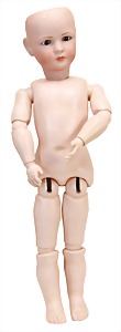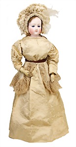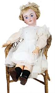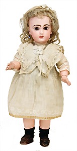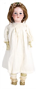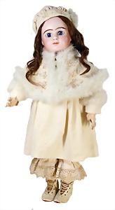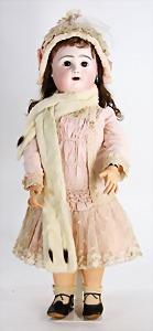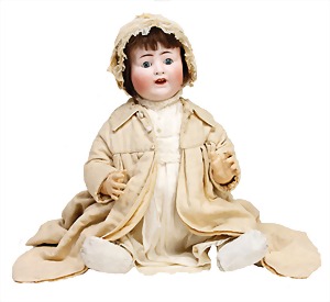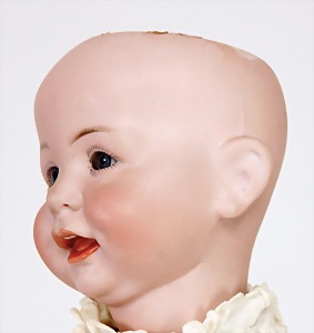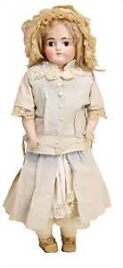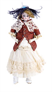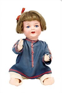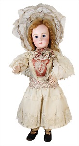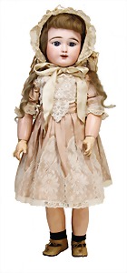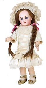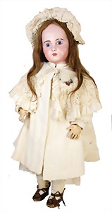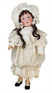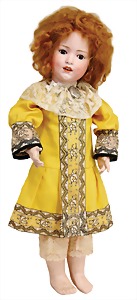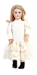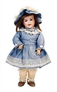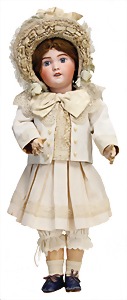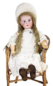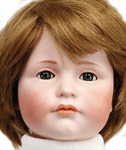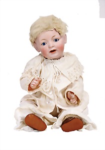 251, Biskuit-Porzellan-Charakter-Puppe, 46 cm, blaue Schlafaugen, off. Mund, Zähne u. Zunge, franz. Toddlerkörper, Brandriss seitl., alte Echthaarperücke, alte Kleidung u. Schuhe