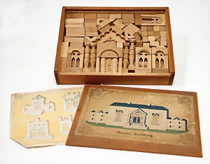 Richters Steinbaukasten, Nr. 19, 4-lagig, wohl auf wenige Steine kompl., auf Vollständigkeit nicht geprüft, viele Metallteile, reichh. Anleitungshefte, davon ein paar Nachdruck, Orig.-Holzkiste, bunt lithogr. Deckbild