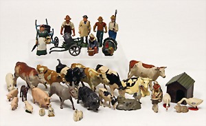 Konv. Blechspielzeug, 1x Antriebsmodell, Brunnen von Doll, 15 cm, altersbed. Farbabplatzer, 1 Blech-Gießkanne, 1 Schubkarre, 1 Trommel (Sparkasse), einige Teile Zinnfiguren, Tieren u. Bäume