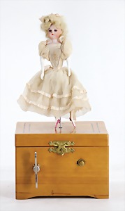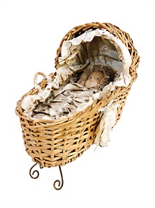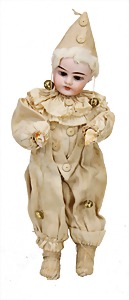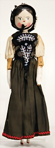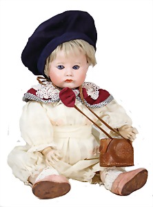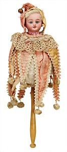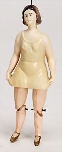 Flessibila, mit Schild, Kunststoffkopf, Echthaarperücke, gemalte Augen, etwas Farbabrieb an der Nasenspitze, Baumwoll-Trikotkörper, weich gestopft, bewegl. Skelett, 47 cm