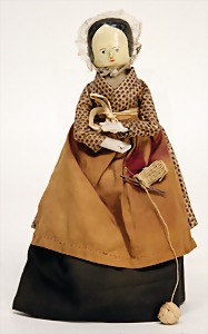 Papiermaché-Brustblattkopf-Puppe, 25 cm, fein ausmodellierte Frisur, gemalte Augen, Orig.-Bemalung, Lederkörper, mit Holz-Armen u. -Beinen, ca. 1840, Kleid altersbed. stark verschlissen, schöne Dekoration für eine sehr frühe Küche, kl. Spannungsriss am Hals
