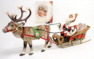 Studio-Gespann, Weihnachtsmann mit Rentier, ca. 40er Jahre, beides elektrisch betrieben, mit Kopfnickmechanik, Weihnachtsmann mit Masse Gesicht, Filzkleidung, auf Holzschlitten, mit Geschenke-Säckchen, Rentier mit Glasaugen, Baumwollplüsch, kl. Stellen am Geweih übermalt, Gesamtlänge ca. 1,10 m, bespielt, schöner Dekorationsartikel, bitte besichtigen
