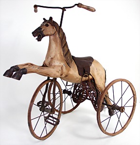 Pferd als Dreirad, Holzräder mit Metallspeichen, Pferd aus Holz mit Glasaugen, Alter ?, L: 80 cm, Sitzhöhe: 52 cm, mit Ledersattel, Griffhöhe: 86 cm