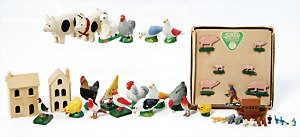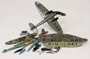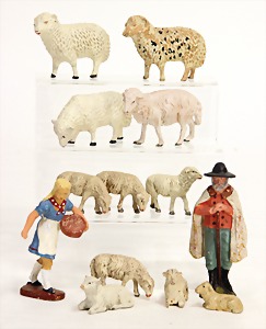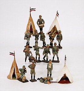 meist Elastolin u. Lineol, 2. Weltkrieg, 7,5 cm, 13 Teile Musiker, kämpfende Figuren, Mann mit Schäferhund, Mann am Telefon, Trommler, stillgestanden, meist Zust. 2 – 3, dazu einige Zubehörteile, Zelte, 2 flache Figuren, Presspappe