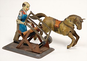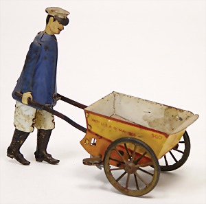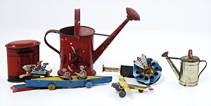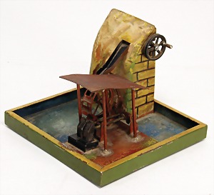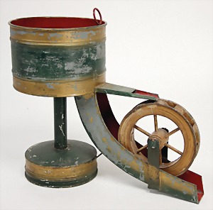 Wasserspiel, Behälter mit Rad, Blech handlackiert, früh, 30 cm, altersbed. Lackfehler, Orig.-Zust.