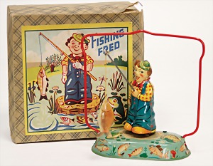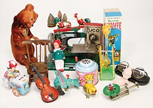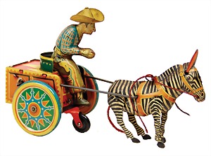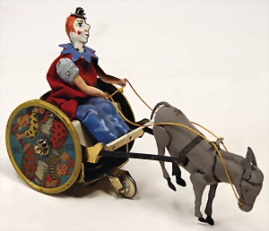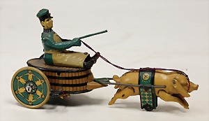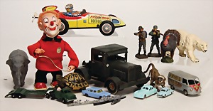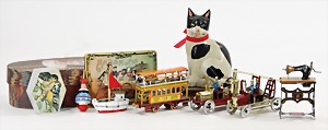 2 Teile Blech, Eisenbahn Rojal, Japan, 15,5 cm, Schwungradantrieb klemmt ein wenig, 1 gestiefelter Kater, Uhrwerk intakt, 1 Bein läuft nicht mit, sonst gut, 1 Hund, Pennytoy, Blech lithogr., 9,5 cm, wohl Vorkrieg