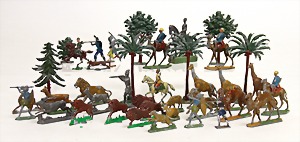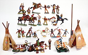 Elastolin, gr. Konv. Kunststoff u. Masse Indianer, 7,5 cm, darunter auch ein Totenpfahl, 2 Figuren übermalt, Siedler u.a., Zust. 2-3