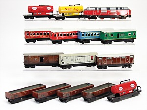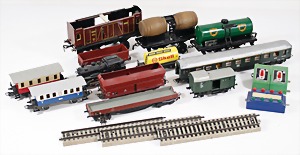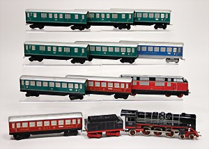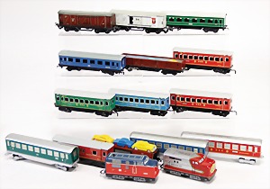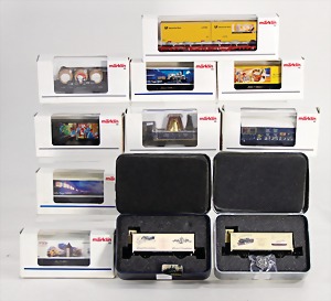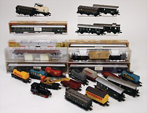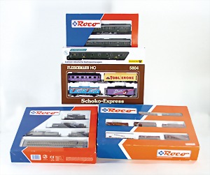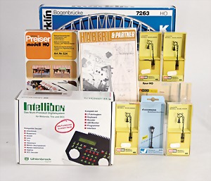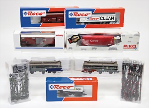 Konv. Personen u.-Güterwagen, ROCCO 46710, 46400, 4642, MÄRKLIN 4727, FLEISCHMANN 5061 K, 5062 K, PICO 54390, dazu einige Oberleitungsmasten, sowie ca. 20 Teile Laternen, im Orig.-Kart. unbespielt